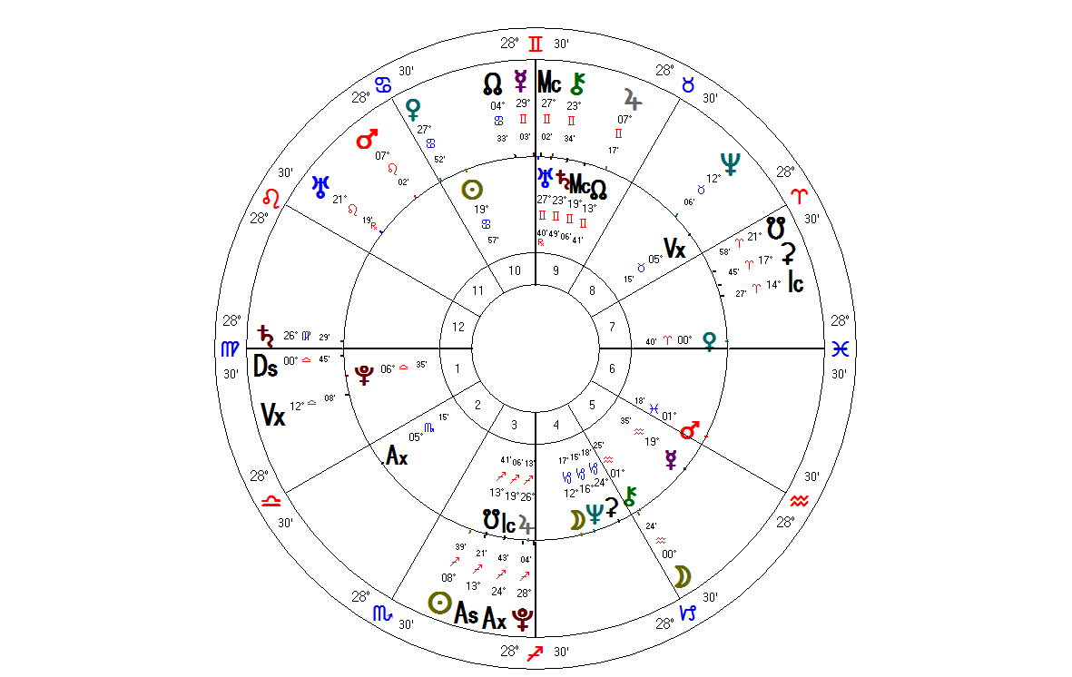 Though it is not illustrated here, the 11th cusp of the Age Harmonic chart is conjunct the Vertex of the Year Harmonic chart  – another timer (and also conjunct the IC of the natal chart).