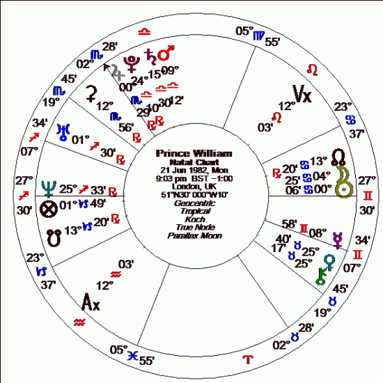 As he has his Sun in Scorpio we would expect some members of his family to have the Sun in aspect to Mars or Pluto or the Sun in the 8th house. His father, Prince Phillip, has his Sun conjunct Mars Prince Phillip and his son, Prince Harry, has the Sun in the 8th house.