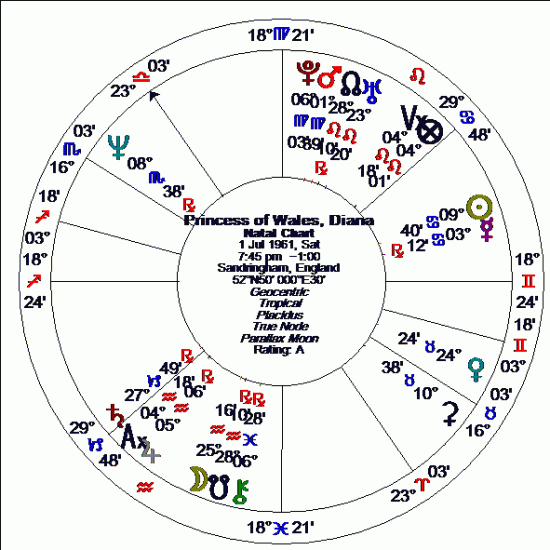 Princess Diana responds very strongly to the Regiomontanus house system and using that system I was both fascinated and amused to see that her equivalent house degree for Mars was 22Scorpio51’24” , in the same degree as Prince Charles’ Sun. In the Topocentric/Placidus house system the equivalent house degree for her Pluto was 22Scorpio15 – also in the same degree as Charles’ Sun!